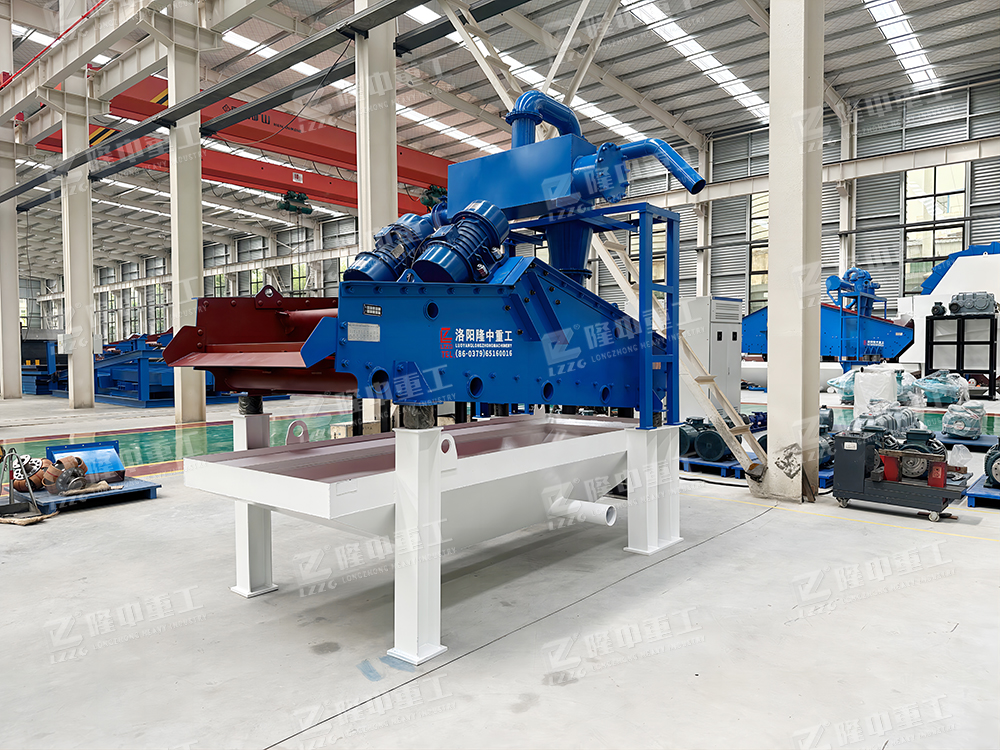 回收部分:而洗砂機溢流的洗砂廢水則進入到該設(shè)備清洗箱中,經(jīng)由底部真空高壓泵抽至旋流器中進行分級濃縮,通過高速離心力和額定的入料壓力,旋流器將洗砂廢水中的細沙與水分離,而后將濃度被提升至60-70%的細沙通過沉沙嘴排入振動脫水篩表面,在高頻振動電機的帶動下,實現(xiàn)細沙的脫水回收,而其他的廢水、泥、粉等雜質(zhì)則通過旋流器溢流口進入返水箱排出。